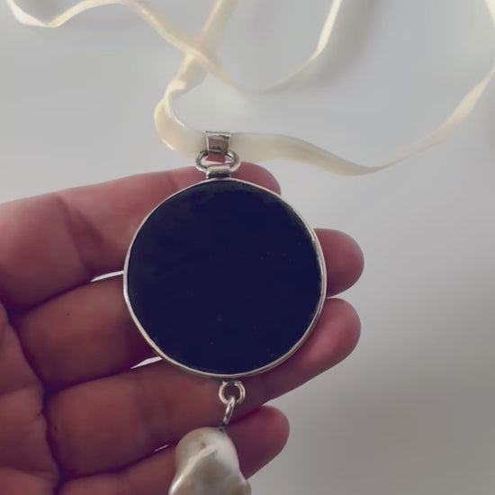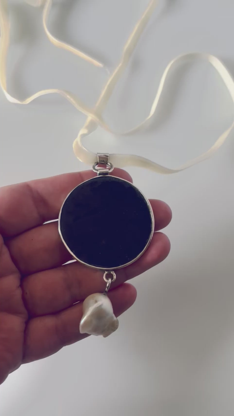 Esmalte montado sobre una base de plata y le cuelga una perla natural.