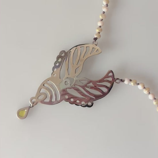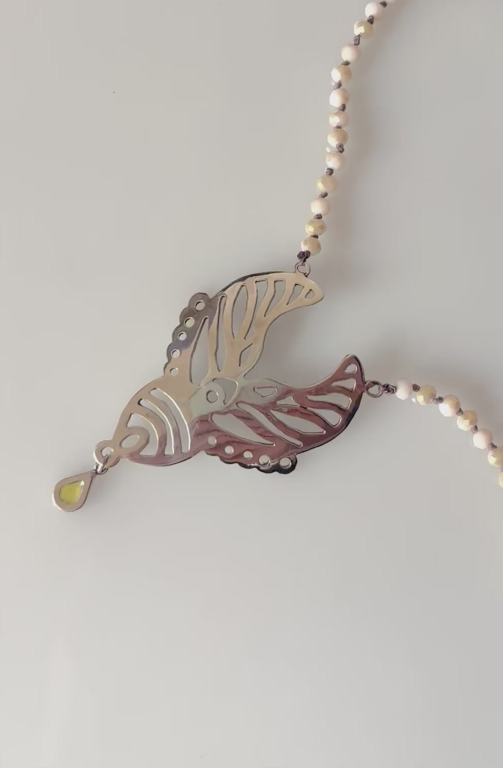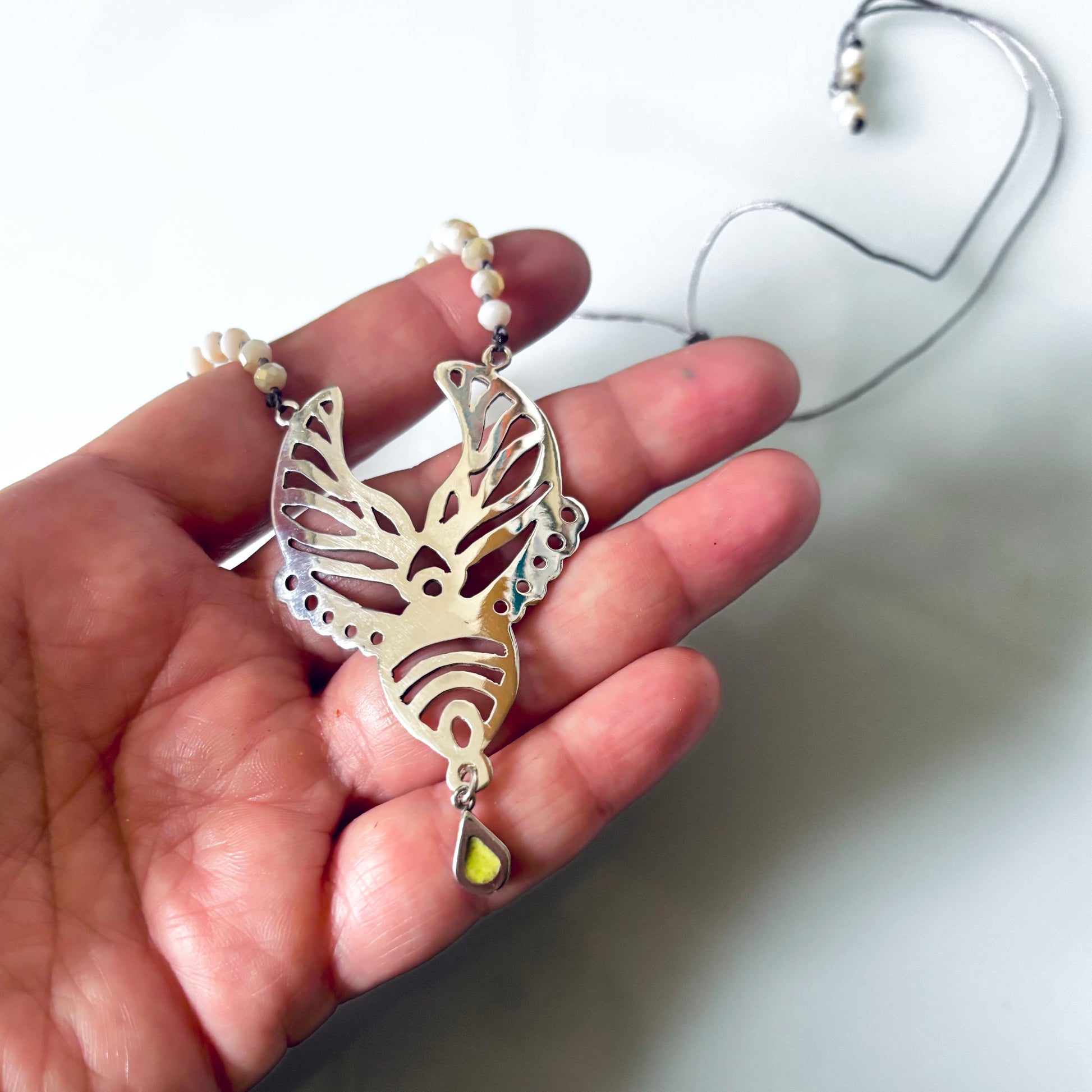 Pieza de plata calada de la cual cuelga una gotita de plata con esmalte . Montado en un hilo de cuentistas de vidrio . El collar cuenta con nudo corredizo para poder ajustar el largo